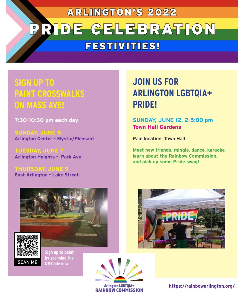 ON SUNDAY, JUNE 12 we will celebrate LGBTQIA+ Arlington Pride from 2-5pm at Town Hall Gardens. We’ll be giving out Rainbow Commission swag and playing music. There might even be some karaoke! After two years of pandemic zooming, we can’t wait to get out and socialize with you! (This event will be held RAIN OR SHINE! If it rains, we can move indoors to Town Hall.)